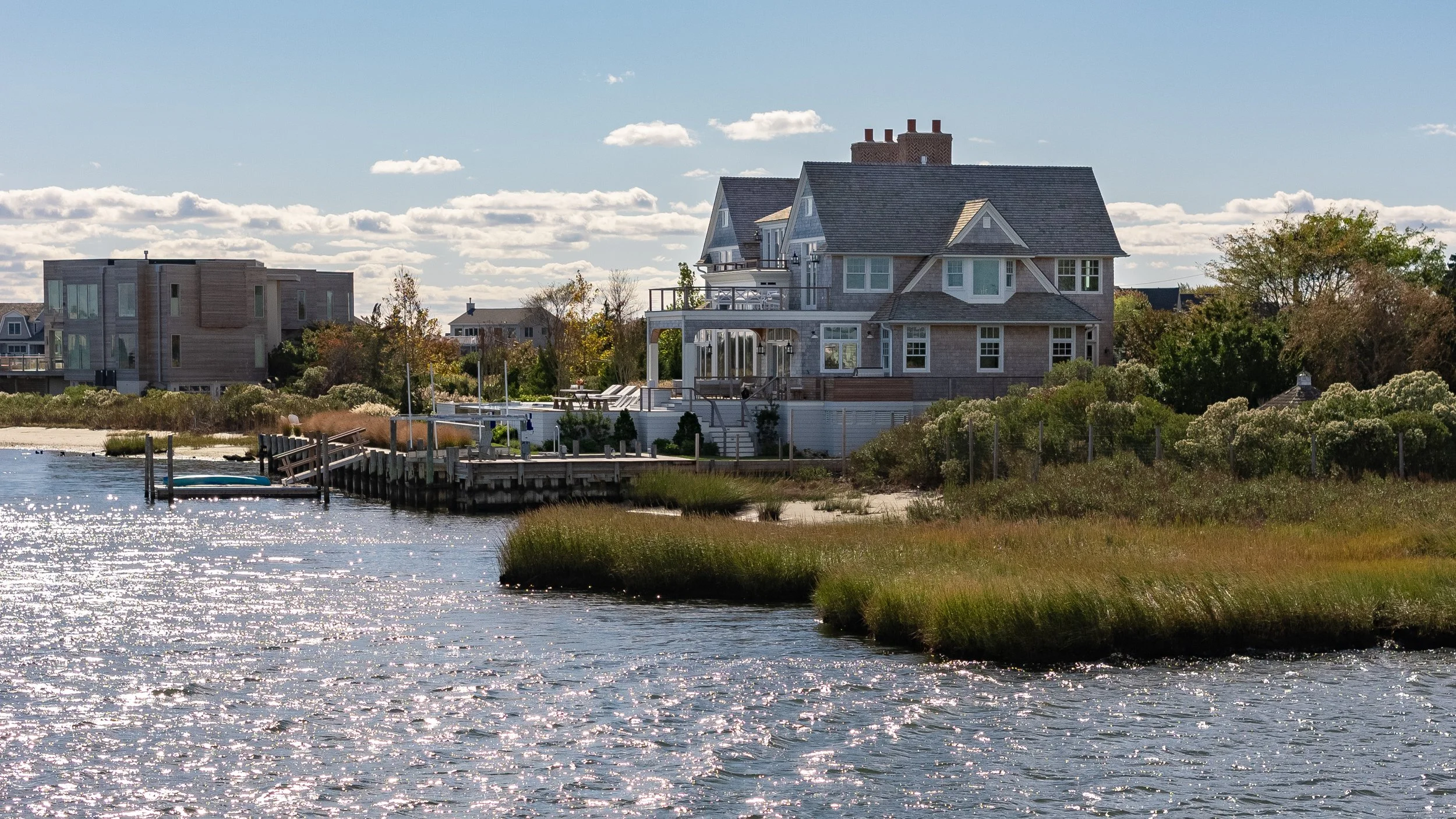 With 270 degree waterfront views across beautiful Quantuck Bay in Westhampton Beach this shingle style is set to bring a families’ dreams to reality. The 5,300-sf home with natural weathered shingles braves the elements and a large family. The home features 6 bedrooms, 4-1/2 baths, living room with 14’ ceilings, a large open kitchen, a second-floor observatory common space with private balcony and a large outdoor space with 3 sided waterfall edge pool.